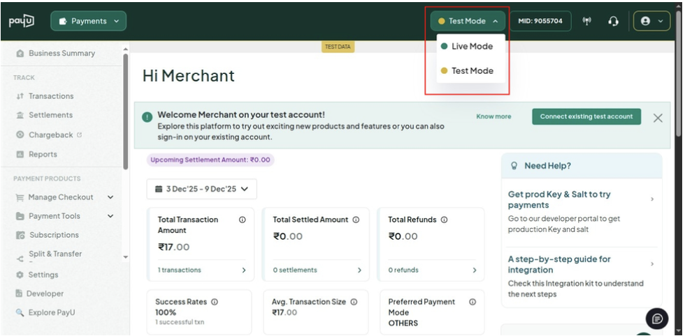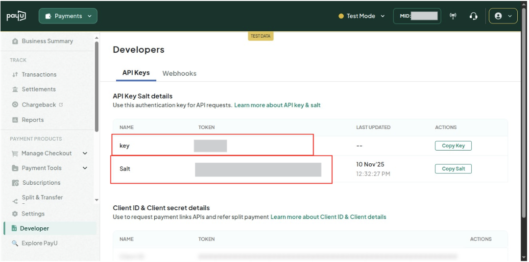 To obtain your Merchant Key and Salt from the PayU Dashboard: