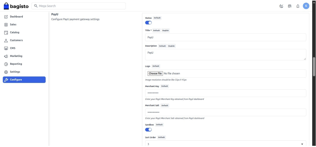 The PayU integration for Bagisto uses a simple key-based authentication method. Merchants only need two credentials to enable secure payment processing: