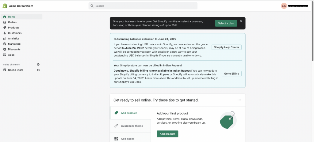 Your Shopify account home page is displayed.
