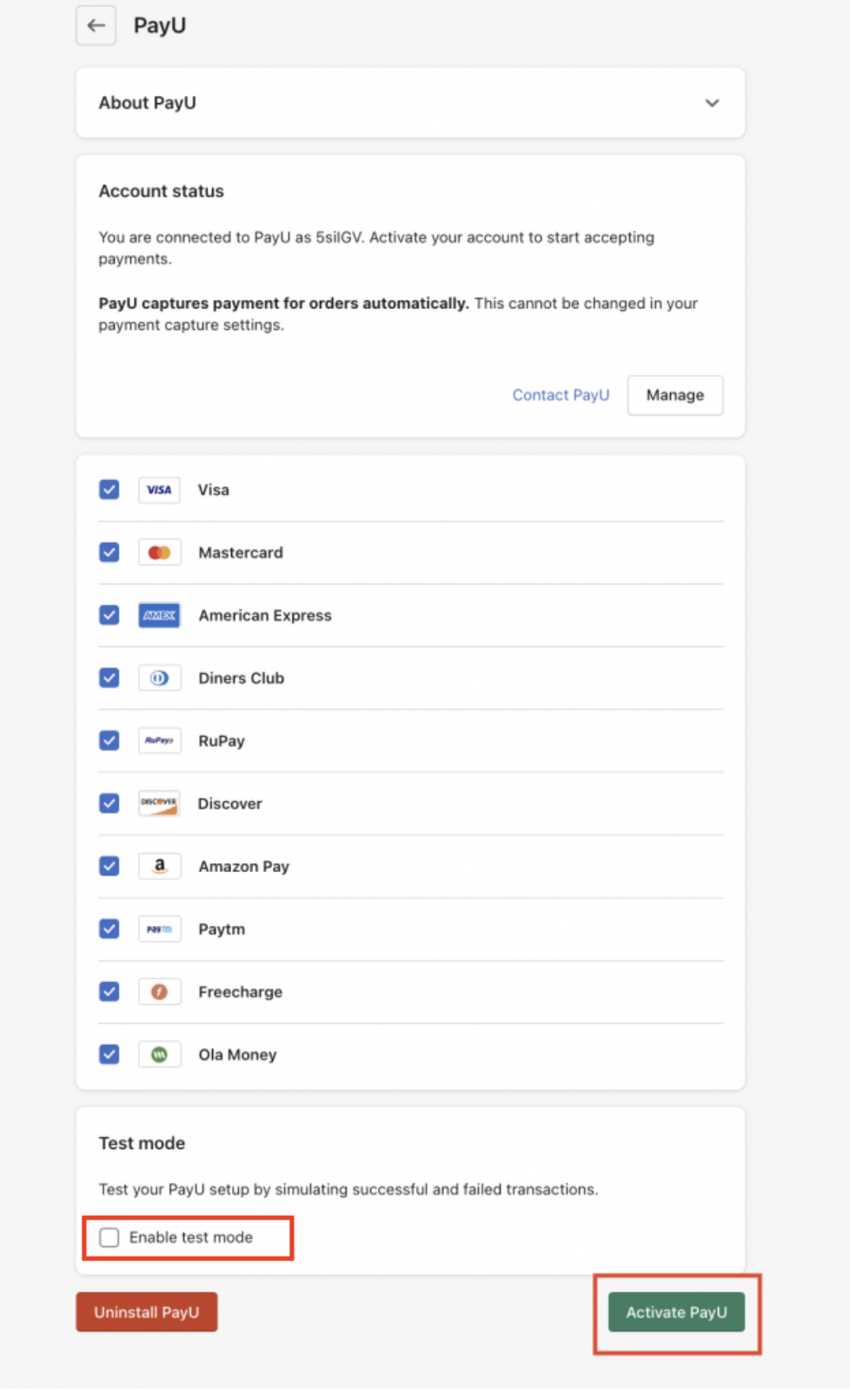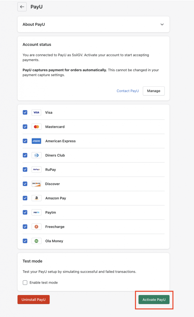 Test Mode for PayU Plugin:You need to test your Shopify integration with your Test key and Salt, so you need to select theEnable test mode check box in this last step before clicking the Activate PayU button: