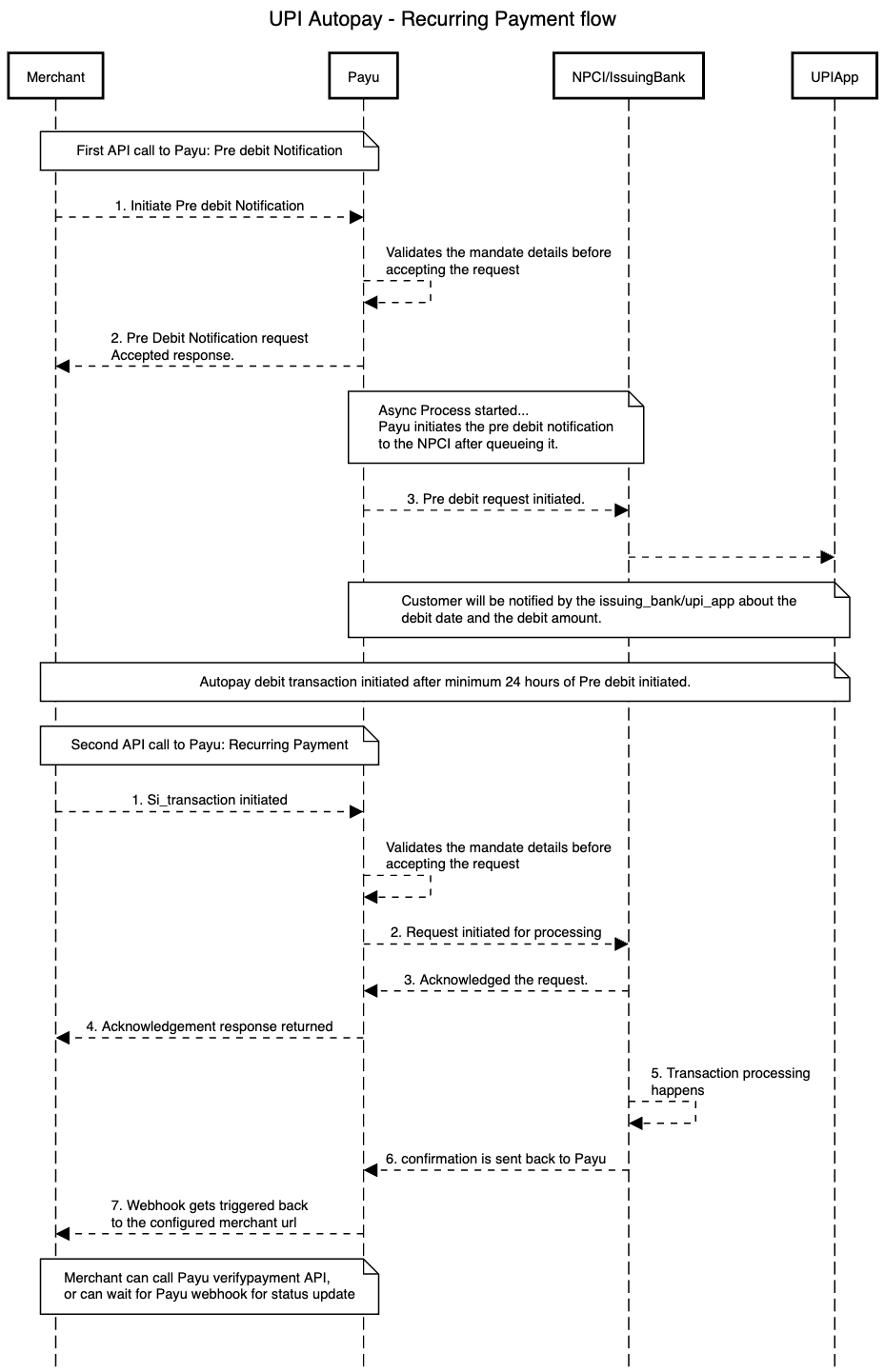 Status Description captured Transaction successful pending Payment initiated with bank/NPCI. Final status will be notified via webhook. failed Transaction failed in-progress Transaction is being processed