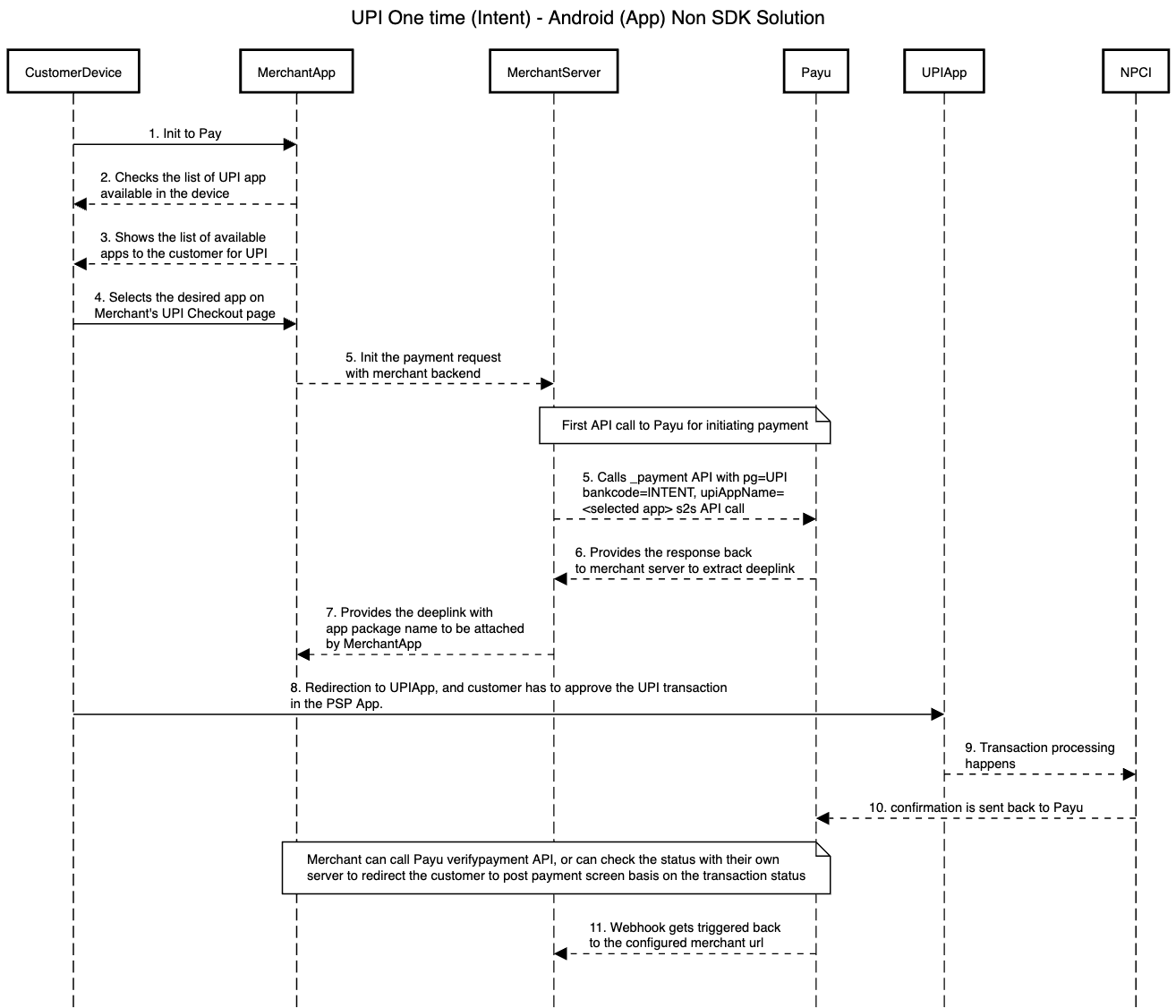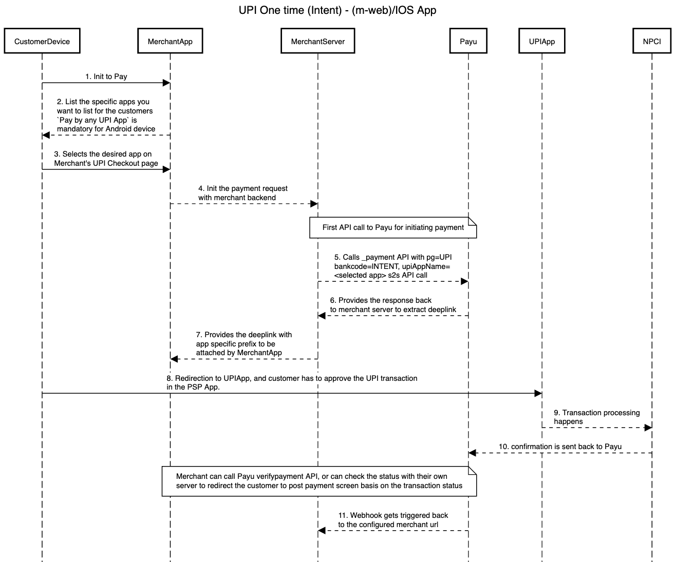 Notes: Specific Intent flow works with m-web, Webview, Android or iOS apps. As per NPCI mandate, Pay by any UPI App option must be shown by all the merchants in their app on all Android devices (app/m-web/webview), Use the generic deeplink, without specific