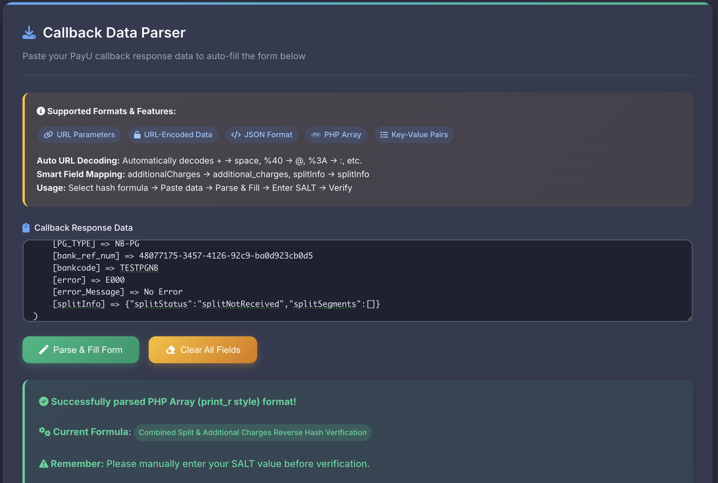 - Click Parse & Fill Form to populate the following fields based on the data in the response • txnid • amount • productinfo • firstname • email • udf1 to udf10 • status • additionalCharges • hash (from PayU)
