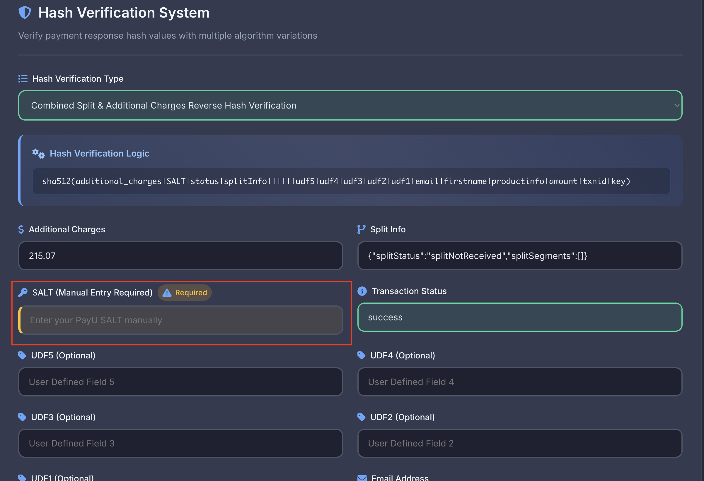 You must enter your merchant salt (provided by PayU) in the SALT field. This is essential for recomputing the hash.